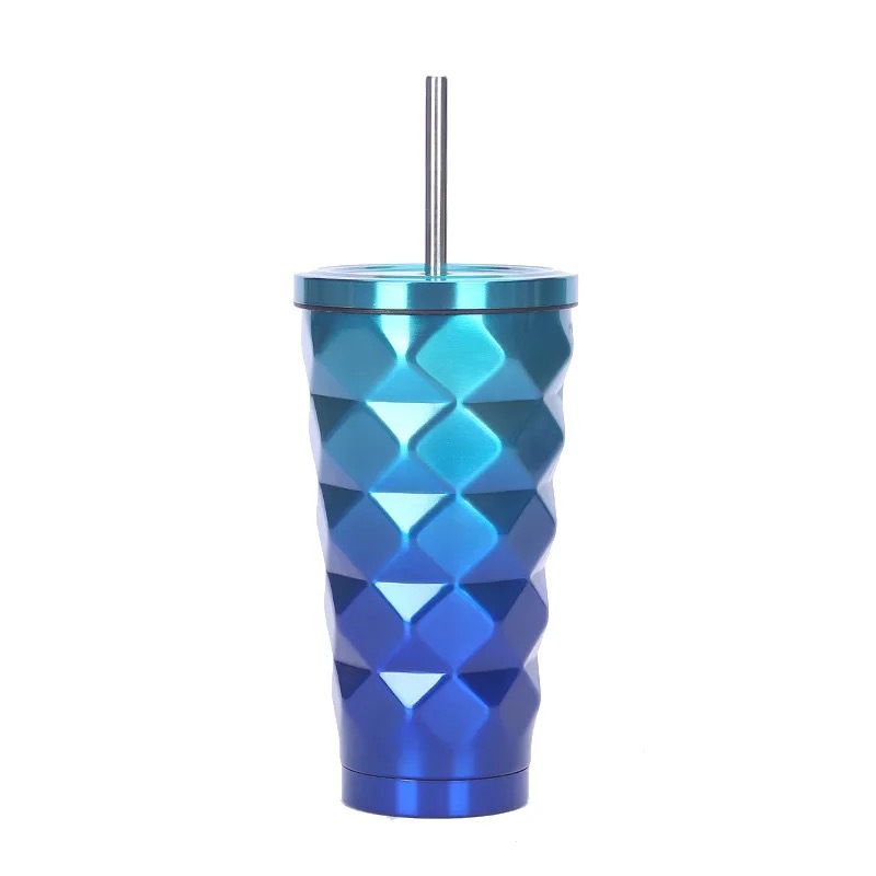 Дизайн: чашка имеет ромбовидный 3D-узор, создающий текстуру, напоминающую ананас, в сочетании с градиентными цветами (такими как оранжево-золотой, сине-фиолетовый, многоцветный и розово-золотой градиенты), что делает ее модной и привлекательной, сочетая при этом художественную привлекательность с текстурой.