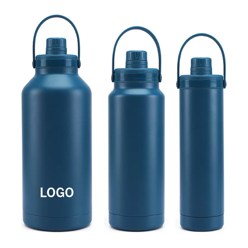 Представляем нашу серию бутылок с синей из нержавеющей стали, доступных в трех размерах. Каждая бутылка имеет удобную ручку для переноски для легкого транспорта. Бутылка может быть настроена с вашим логотипом, что делает ее идеальным для продвижения бренда или персонализации. Эти бутылки, идеально подходящие для составления гидратированных во время занятий на свежем воздухе, тренировок или ежедневных поездок, сочетают в себе функциональность с гладким дизайном.