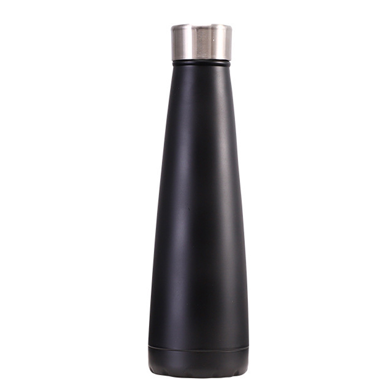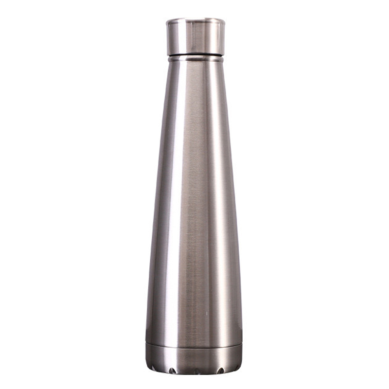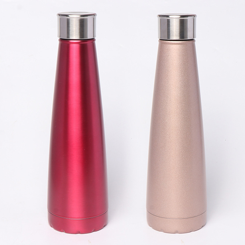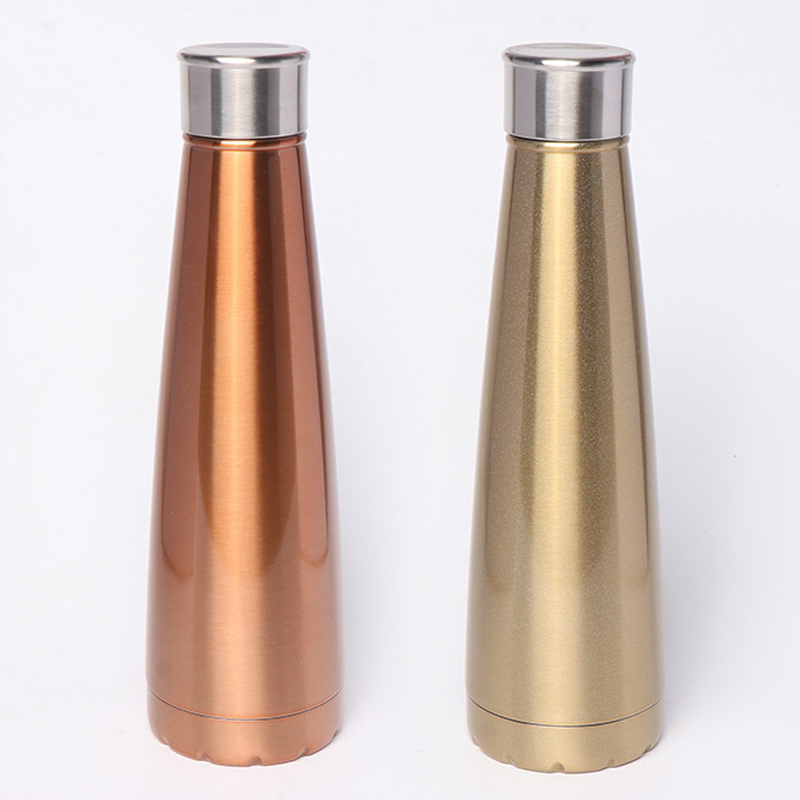 Это золотая - цветная термос бутылка. Его высота составляет 25,5 см, а диаметр - 7,7 см. Он имеет гладкий конический дизайн с нержавеющей стальной крышкой, представляющий элегантный и стильный вид.